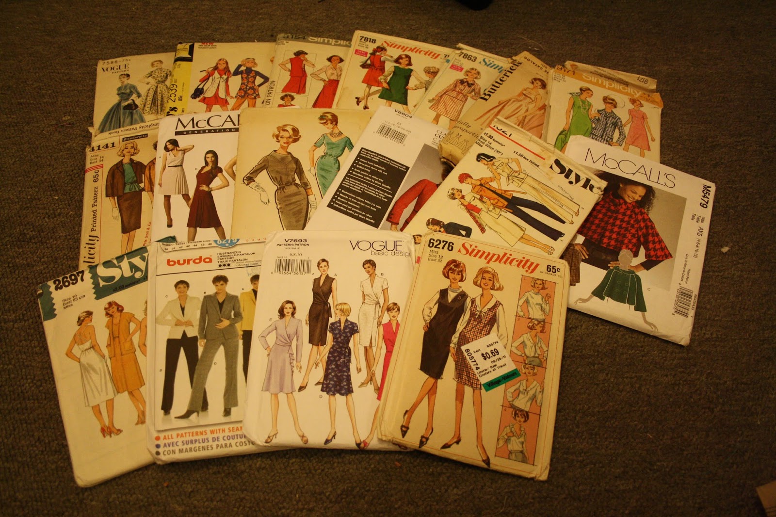 Damn, that’s a lot of patterns! We have the stunning Vogue 7588 (36″ bust), the funky McCall’s 2539 (33.5″ bust), a classy Simplicity 4141 (34″ bust) separates set, and then another in Simplicity 8154 (36″ bust)! The adorable Simplicity 7818 jumper dress (36″ bust) and the equally adorable Simplicity 7863 suit set (34″). I wish I was a few sizes smaller! We have the elegant Butterick 2304 (34″ bust) making an appearance, together with the Mad Men-esque Simplicity 9171 (40″ bust). If you wanted to get started on autumn clothes already, there’s McCall’s 5479 (29.5 – 34″ bust) and then a trenchcoat/pant set made by Style 1821 (36″ bust). There’s the gorgeous Claire Schaeffer designed jacket V8804 (36 – 44″ bust) and the bombshell McCall’s 5996 (34″ bust). A more modern dress by McCall’s 6433 (29.5 – 34″ bust), and a lovely wrap dress in the form of Vogue 7693 (30 – 32.5″ bust). Finally, we have a cute blouse/dress combo Simplicity 6276 (32″ bust), a Burda 8279 pantsuit (36 – 48″ bust) and the flowy Style 2697 (32.5″ bust).