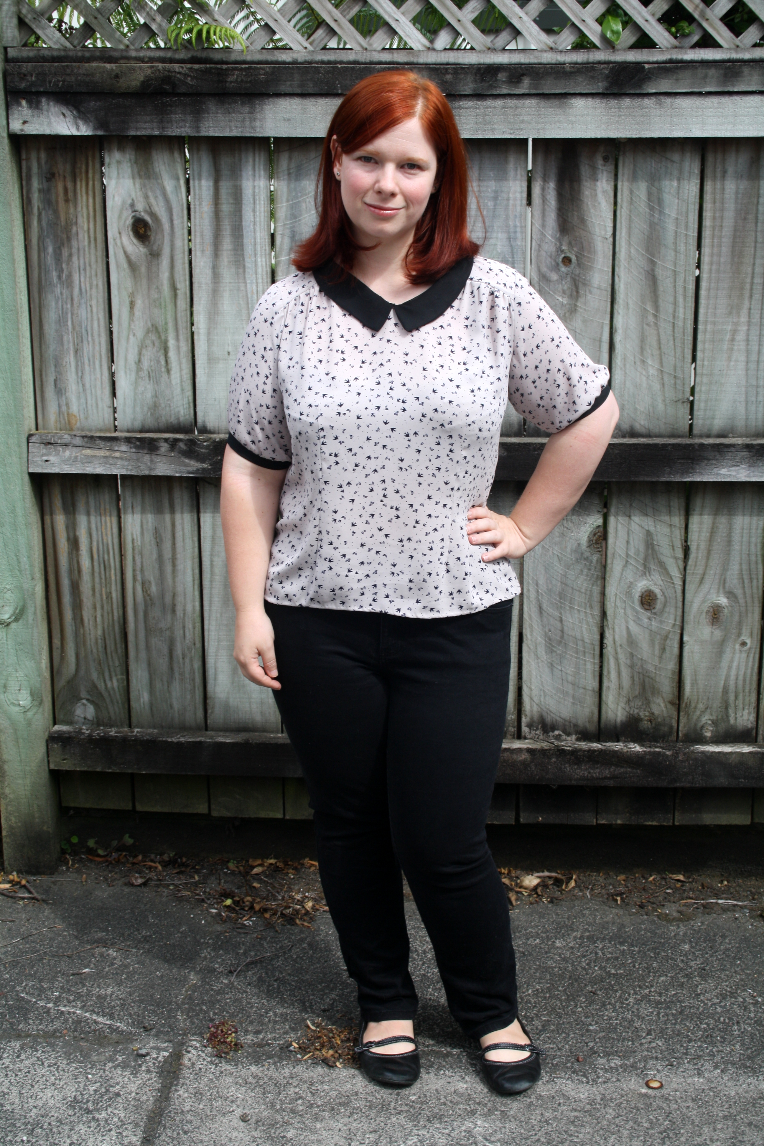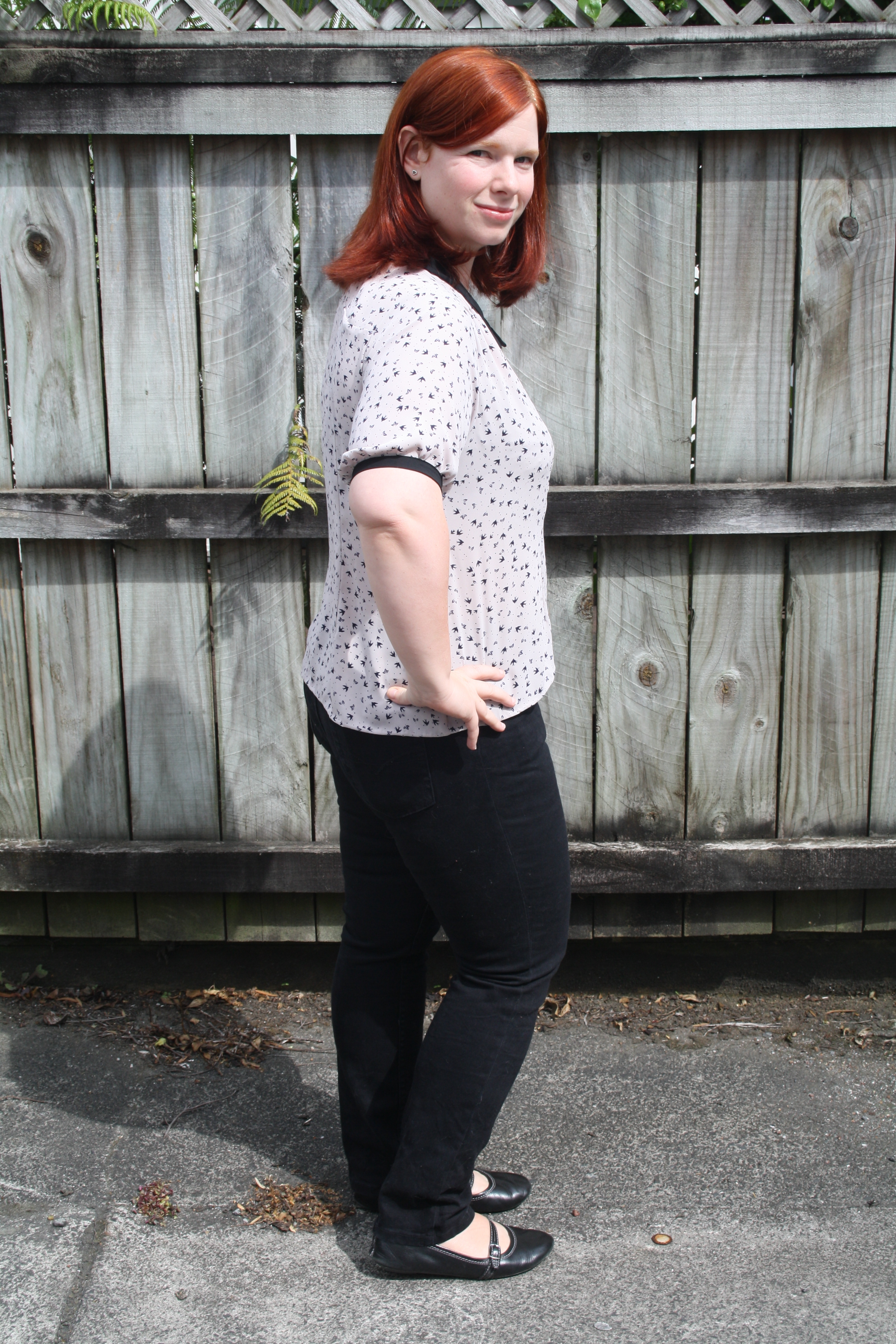 I wear it quite a bit with jeans, but I wanted something a bit flowy for my next one, and also without the hi-lo hem. I bought a gorgeous flamingo-print rayon voile from Hart’s Fabric earlier this year, and decided it was the perfect candidate for the next blouse. Sadly, it seems they’ve sold out – the fabric felt so soft and drapy, it’s honestly the nicest fabric I’ve ever touched! I need more rayon voile in my life. I don’t usually wear the blouse with the checked skirt as above, I have a navy blue midi skirt with pleats I bought from Uniqlo in Japan that suits it perfectly. Or, I wear it with jeans as pictured below: