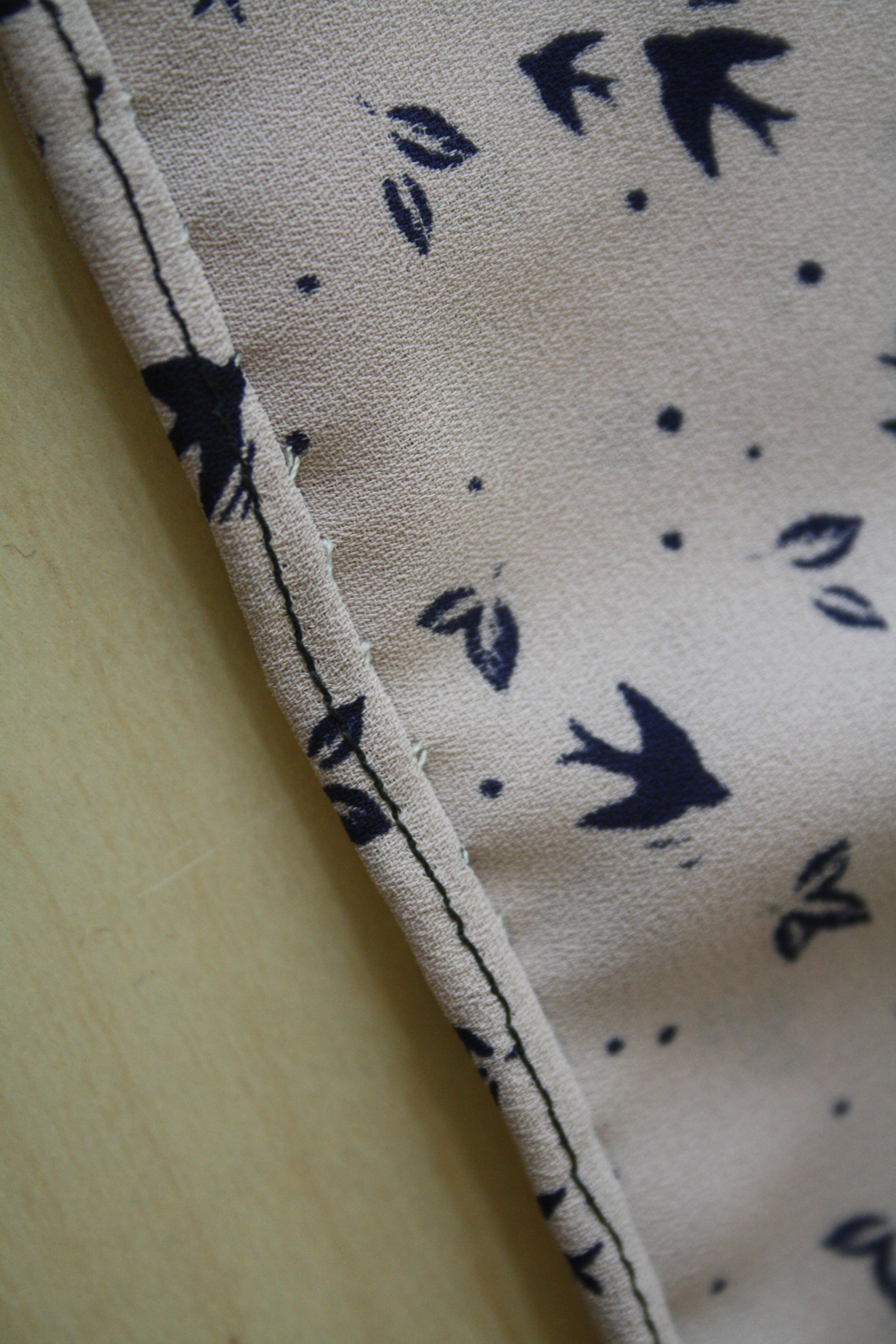 I made bias binding from the same flamingo fabric to hem it, since it has quite a curve on the sides and it made it much easier to deal with. Making the binding was a bit time-consuming though as it was too floaty to put through my Clover bias binding maker and kept slipping everywhere, so I had to do it the old-fashioned way – pressing it in half and then pressing each half towards the middle. Worth it though! The blouse has facings, which tend to flip out in thi fabric, so I tacked them to the shoulder seams and catch-stitched them in a few strategic places. Any tips on how to secure them further would be great though!